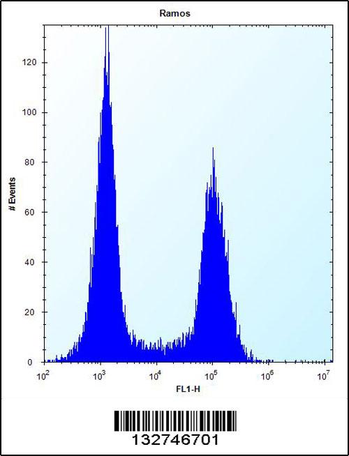 TM55B Antibody (C-term) (Cat. APC00042G) flow cytometric analysis of Ramos cells (right histogram) compared to a negative control cell (left histogram).FITC-conjugated donkey-anti-rabbit secondary antibodies were used for the analysis. |