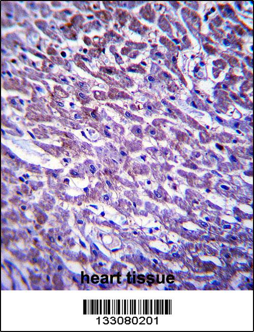 XIRP1 Antibody (C-term) (Cat. AMM08704G)immunohistochemistry analysis in formalin fixed and paraffin embedded human heart tissue followed by peroxidase conjugation of the secondary antibody and DAB staining.This data demonstrates the use of XIRP1 Antibody (C-term) for immunohistochemistry. Clinical relevance has not been evaluated. |