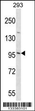 EMILIN3 Antibody (C-term) (Cat. AMM08622G) western blot analysis in 293 cell line lysates (35ug/lane).This demonstrates the EMILIN3 antibody detected the EMILIN3 protein (arrow).