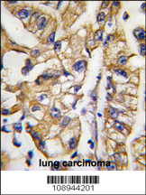 Formalin-fixed and paraffin-embedded human lung carcinoma tissue reacted with HDBP1 Antibody (Center) (Cat. APR10882G), which was peroxidase-conjugated to the secondary antibody, followed by DAB staining. This data demonstrates the use of this antibody for immunohistochemistry; clinical relevance has not been evaluated. |