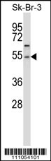 PPM1A Antibody (pS) (Cat. AMM08665G) western blot analysis in SK-BR-3 cell line lysates (35ug/lane).This demonstrates the PPM1A antibody detected the PPM1A protein (arrow). |