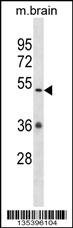Mouse Camkv Antibody (N-term) (Cat. AMM08650G) western blot analysis in mouse brain tissue lysates (35ug/lane).This demonstrates the Camkv antibody detected the Camkv protein (arrow). |