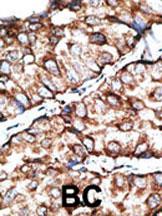 Formalin-fixed and paraffin-embedded human cancer tissue reacted with the primary antibody, which was peroxidase-conjugated to the secondary antibody, followed by DAB staining. This data demonstrates the use of this antibody for immunohistochemistry; clinical relevance has not been evaluated. BC = breast carcinoma; HC = hepatocarcinoma. |