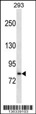 SLC39A6 Antibody (Cat. APR10926G) western blot analysis in 293 cell line lysates (35ug/lane).This demonstrates the SLC39A6 antibody detected the SLC39A6 protein (arrow). |
