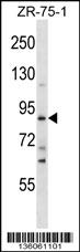 SLITRK4 Antibody (C-term) (Cat. APR14252G) western blot analysis in ZR-75-1 cell line lysates (35ug/lane).This demonstrates the SLITRK4 antibody detected the SLITRK4 protein (arrow). |