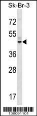 GPR87 Antibody (C-term) (Cat. AMM08631G) western blot analysis in SK-BR-3 cell line lysates (35ug/lane).This demonstrates the GPR87 antibody detected the GPR87 protein (arrow). |