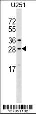 OSTF1 Antibody (N-term) (Cat. AMM08660G) western blot analysis in U251 cell line lysates (35ug/lane).This demonstrates the OSTF1 antibody detected the OSTF1 protein (arrow). |