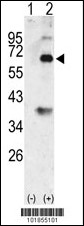 Western blot analysis of Bmp3 (arrow) using rabbit polyclonal Bmp3 Antibody (N-term) (Cat. AMM08601G). 293 cell lysates (2 ug/lane) either nontransfected (Lane 1) or transiently transfected with the Bmp3 gene (Lane 2) (Origene Technologies).