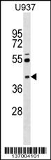 SKAP2 Antibody (Center) (Cat. AMM08685G) western blot analysis in U937 cell line lysates (35ug/lane).This demonstrates the SKAP2 antibody detected the SKAP2 protein (arrow). |