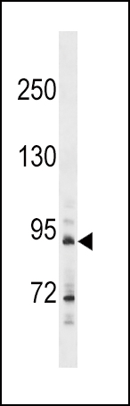 HHIP Antibody (N-term) (Cat. AMM08635G) western blot analysis in A549 cell line lysates (35ug/lane).This demonstrates the HHIP antibody detected the HHIP protein (arrow). |