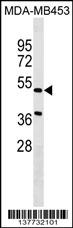 NPNT Antibody (Center) (Cat. AMM08659G) western blot analysis in MDA-MB453 cell line lysates (35ug/lane).This demonstrates the NPNT antibody detected the NPNT protein (arrow). |