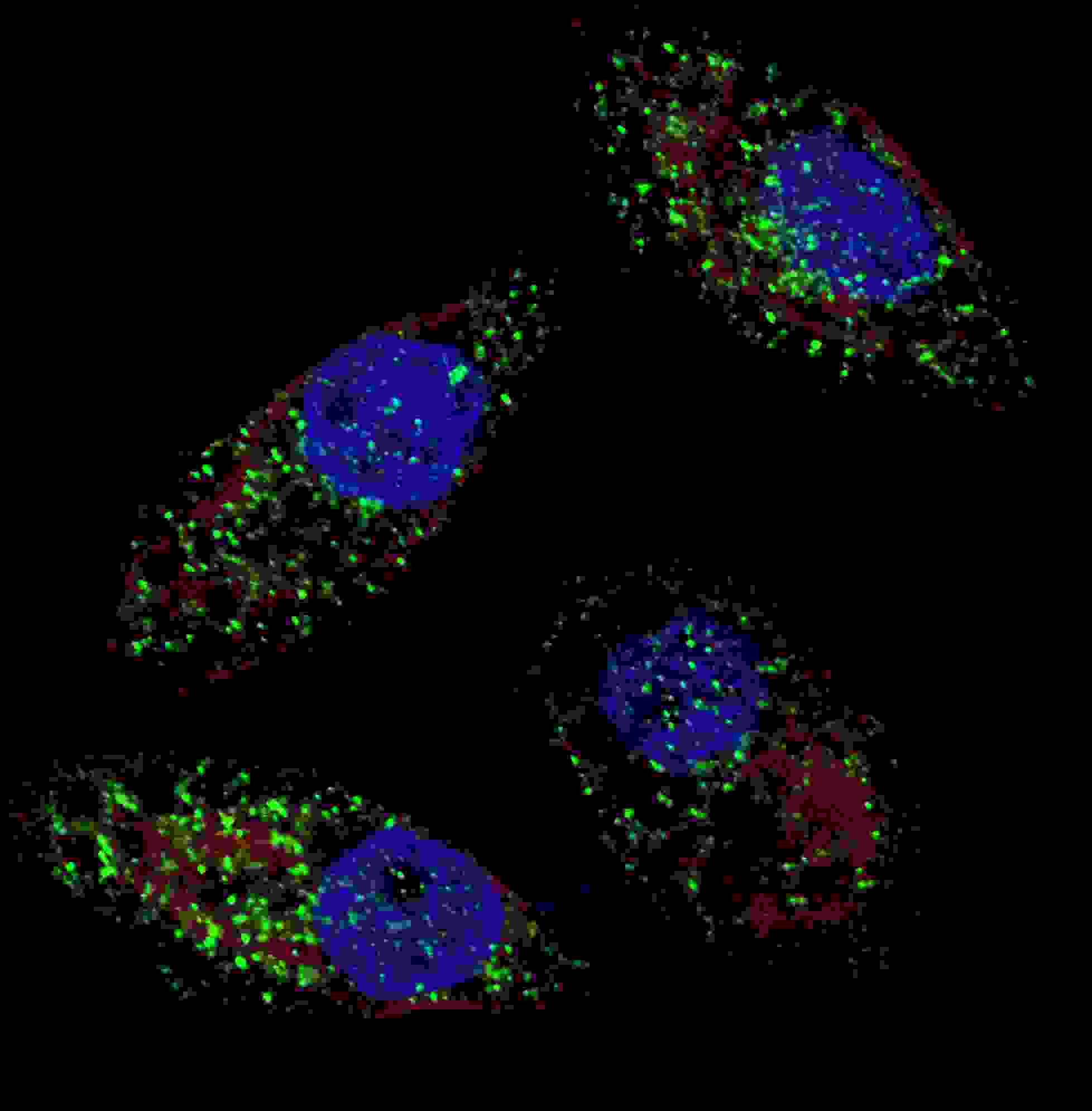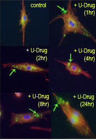 Time course study of mouse leukaemic monocyte macrophage cells treated with U18666A, a drug that causes cholesterol and lipid storage in cells, thereby blocking fusion between late endosomes and lysosomes. Cleaved-LC3 (APG8b) antibody (Cat APR06991G) detected punctuate staining indicative of autophagic vacuole or phagosome structures. Data courtesy of Dr. Barry Boland, Department of Pharmacology, Oxford University.