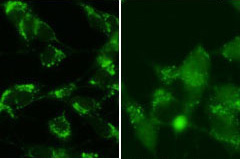 SY5Y cells were pretreated with 5nM bafilomycin for 24hr and fixed in methanol (left panel) or 4% of paraformaldehyde (right panel). Treatment with APR06991G antibody at dilution 1:100. Data courtesy of Jianhui Zhu, MD, PhD & Charleen T. Chu, MD, PhD, University of Pittsburgh School of Medicine. |