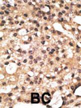 Formalin-fixed and paraffin-embedded human cancer tissue reacted with the primary antibody, which was peroxidase-conjugated to the secondary antibody, followed by DAB staining. This data demonstrates the use of this antibody for immunohistochemistry; clinical relevance has not been evaluated. BC = breast carcinoma; HC = hepatocarcinoma. |