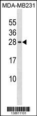 PIN4 Antibody (N-term) (Cat. APR10910G) western blot analysis in MDA-MB231 cell line lysates (35ug/lane).This demonstrates the PIN4 antibody detected the PIN4 protein (arrow). |