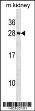 Mouse Rcvrn Antibody (N-term)(Cat. APR14133G) western blot analysis in mouse kidney tissue lysates (35ug/lane).This demonstrates the Rcvrn antibody detected the Rcvrn protein (arrow). |