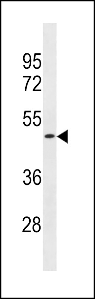 OR1S2 Antibody (C-term) (Cat. APR14161G) western blot analysis in ZR-75-1 cell line lysates (35ug/lane).This demonstrates the OR1S2 antibody detected the OR1S2 protein (arrow). |