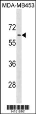 ADRA1B Antibody (C-term) (Cat. APR14085G) western blot analysis in MDA-MB453 cell line lysates (35ug/lane).This demonstrates the ADRA1B antibody detected the ADRA1B protein (arrow). |