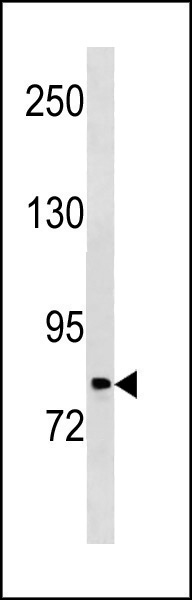 PLOD2 Antibody (C-term) (Cat. APR10906G) western blot analysis in Hela cell line lysates (35ug/lane).This demonstrates the PLOD2 antibody detected the PLOD2 protein (arrow). |