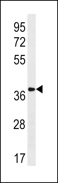 OXGR1 Antibody (C-term) (Cat. AMM08661G) western blot analysis in human placenta tissue lysates (35ug/lane).This demonstrates the OXGR1 antibody detected the OXGR1 protein (arrow). |