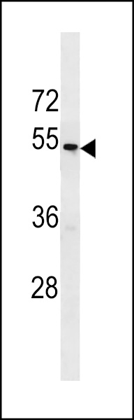 TAS2R43 Antibody (Center) (Cat. APR14263G) western blot analysis in T47D cell line lysates (35ug/lane).This demonstrates the TAS2R43 antibody detected the TAS2R43 protein (arrow). |