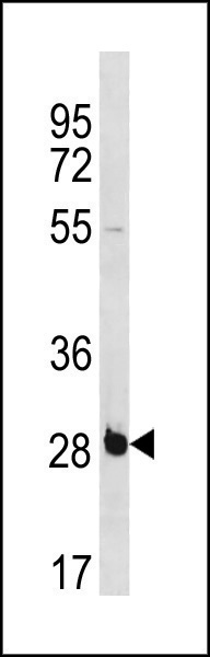 RBPMS Antibody (C-term) (Cat. AMM08673G) western blot analysis in NCI-H460 cell line lysates (35ug/lane).This demonstrates the RBPMS antibody detected the RBPMS protein (arrow). |
