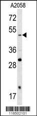 Western blot analysis of SOX4 antibody (N-term) (Cat. APR14074G) in A2058 cell line lysates (35ug/lane). SOX4 (arrow) was detected using the purified Pab.