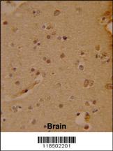 Formalin-fixed and paraffin-embedded human brain reacted with SOX4 Antibody (N-term), which was peroxidase-conjugated to the secondary antibody, followed by DAB staining. This data demonstrates the use of this antibody for immunohistochemistry; clinical relevance has not been evaluated.