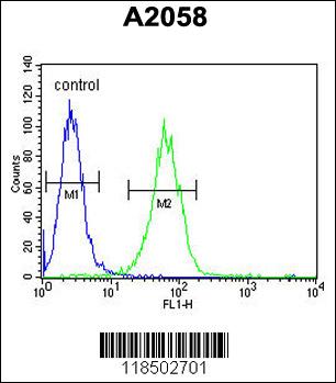 SOX4 Antibody (N-term) (Cat. APR14074G) flow cytometric analysis of A2058 cells (right histogram) compared to a negative control cell (left histogram).FITC-conjugated goat-anti-rabbit secondary antibodies were used for the analysis. |