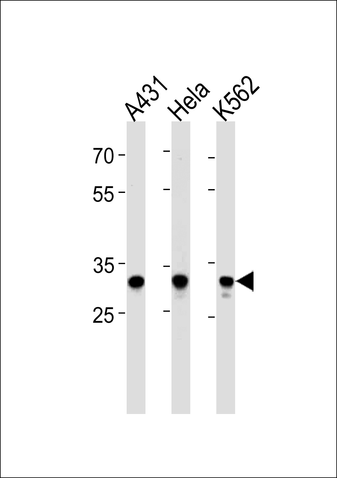 APBB3 Antibody (Center) (Cat. APR14090G) western blot analysis in A431,Hela,K562 cell line lysates (35ug/lane).This demonstrates the APBB3 antibody detected the APBB3 protein (arrow). |