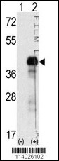 Western blot analysis of SOX2 (arrow) using rabbit polyclonal SOX2 Antibody (N-term) (Cat. APR14065G). 293 cell lysates (2 ug/lane) either nontransfected (Lane 1) or transiently transfected with the SOX2 gene (Lane 2) (Origene Technologies).