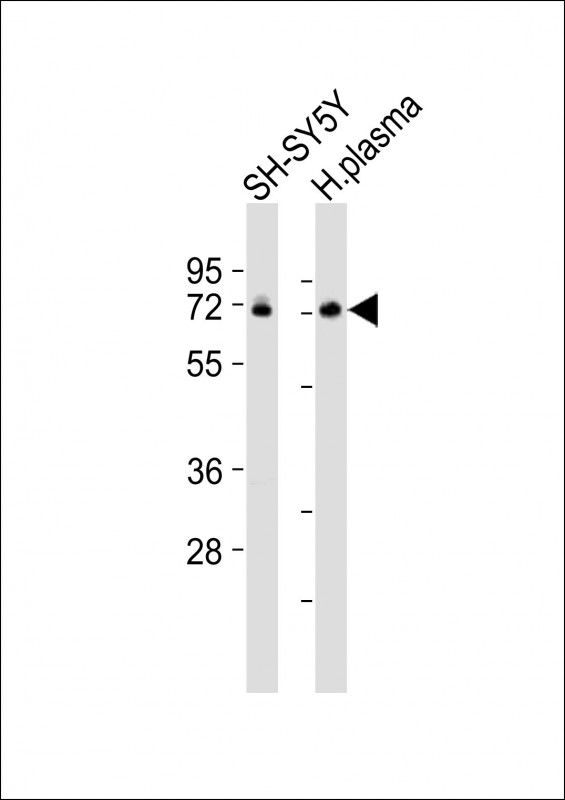 All lanes : Anti-DBH Antibody (Center) at 1:2000 dilution Lane 1: SH-SY5Y whole cell lysates Lane 2: human plasma lysates Lysates/proteins at 20 μg per lane. Secondary Goat Anti-Rabbit IgG, (H+L), Peroxidase conjugated at 1/10000 dilution Predicted band size : 69 kDa Blocking/Dilution buffer: 5% NFDM/TBST. |