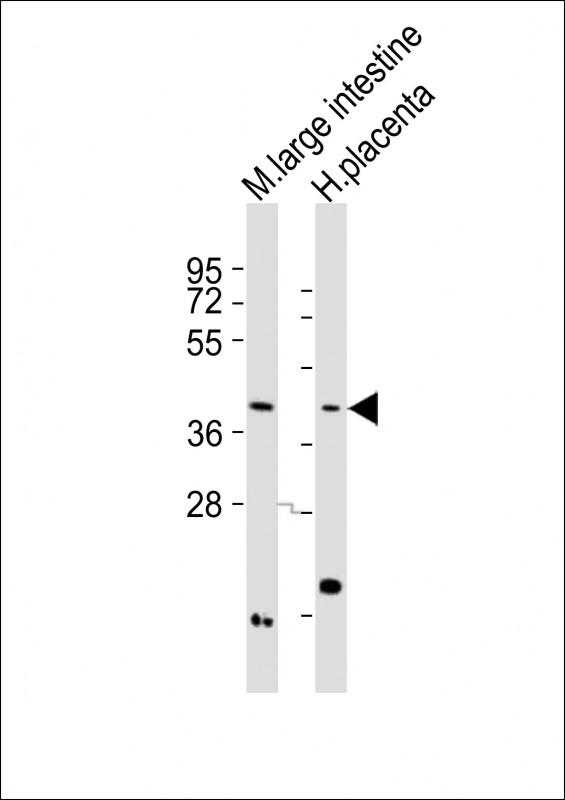 All lanes : Anti-MC3R Antibody (C-term) at 1:2000 dilution Lane 1: mouse large intestine lysates Lane 2: human placenta lysates Lysates/proteins at 20 μg per lane. Secondary Goat Anti-Rabbit IgG, (H+L), Peroxidase conjugated at 1/10000 dilution Predicted band size : 36 kDa Blocking/Dilution buffer: 5% NFDM/TBST. |