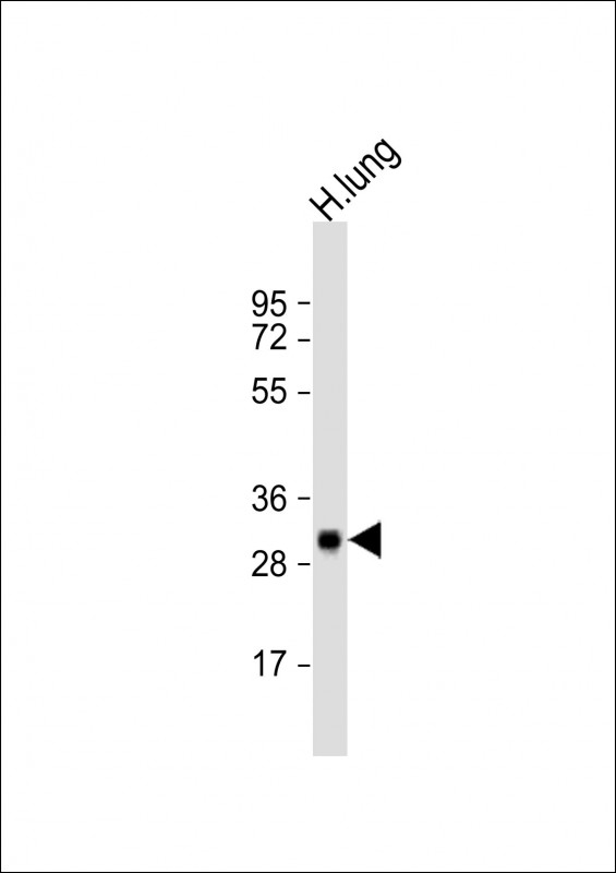 Anti-SULT1A1 Antibody (Center)at 1:2000 dilution + human lung lysates Lysates/proteins at 20 μg per lane. Secondary Goat Anti-Rabbit IgG, (H+L), Peroxidase conjugated at 1/10000 dilution Predicted band size : 34 kDa Blocking/Dilution buffer: 5% NFDM/TBST. |