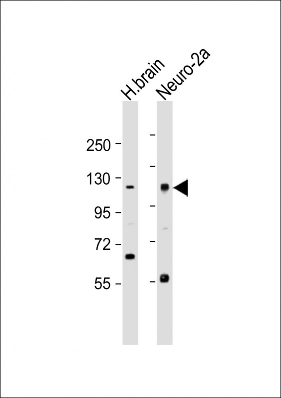 All lanes : Anti-NELL1 Antibody (C-term) at 1:2000 dilution Lane 1: human brain lysates Lane 2: Neuro-2a whole cell lysates Lysates/proteins at 20 μg per lane. Secondary Goat Anti-Rabbit IgG, (H+L), Peroxidase conjugated at 1/10000 dilution Predicted band size : 90 kDa Blocking/Dilution buffer: 5% NFDM/TBST. |