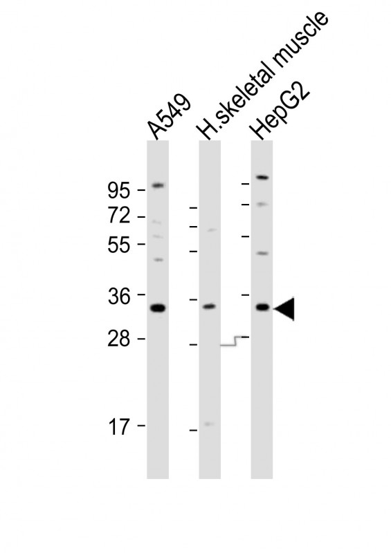 All lanes : Anti-ANP32E Antibody (N-term) at 1:2000 dilution Lane 1: A549 whole cell lysates Lane 2: human skeletal muscle lysates Lane 3: HepG2 whole cell lysates Lysates/proteins at 20 μg per lane. Secondary Goat Anti-Rabbit IgG, (H+L), Peroxidase conjugated at 1/10000 dilution Predicted band size : 31 kDa Blocking/Dilution buffer: 5% NFDM/TBST. |