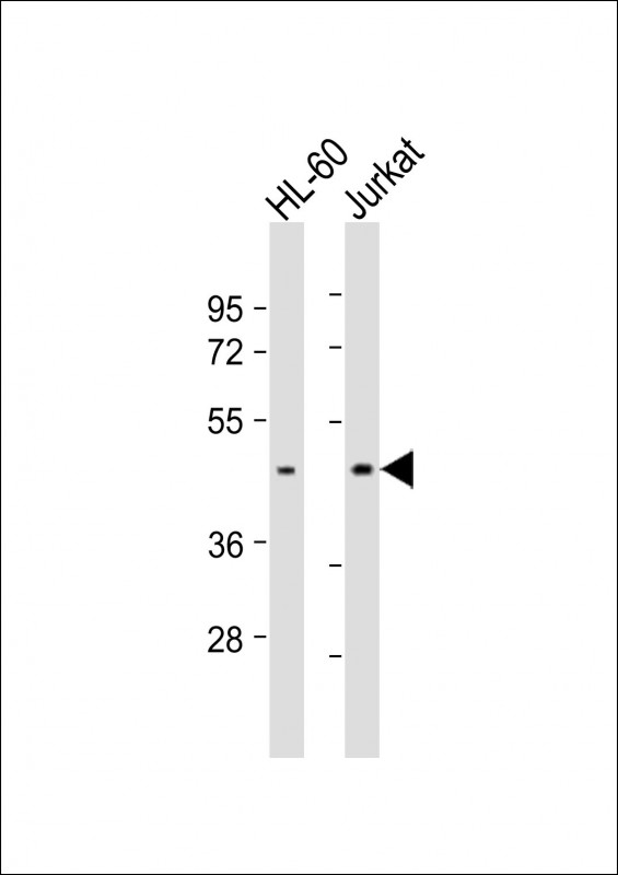 All lanes : Anti-IHH Antibody (C-term) at 1:2000 dilution Lane 1: HL-60 whole cell lysates Lane 2: Jurkat whole cell lysates Lysates/proteins at 20 μg per lane. Secondary Goat Anti-Rabbit IgG, (H+L), Peroxidase conjugated at 1/10000 dilution Predicted band size : 45 kDa Blocking/Dilution buffer: 5% NFDM/TBST. |