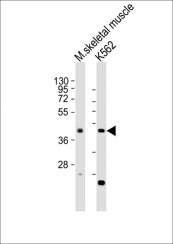 All lanes : Anti-ACTL6A Antibody (N-term) at 1:2000 dilution Lane 1: mouse skeletal muscle lysates Lane 2: K562 whole cell lysates Lysates/proteins at 20 μg per lane. Secondary Goat Anti-Rabbit IgG, (H+L), Peroxidase conjugated at 1/10000 dilution Predicted band size : 47 kDa Blocking/Dilution buffer: 5% NFDM/TBST. |
