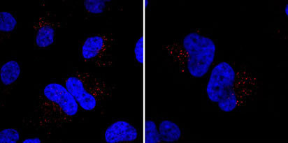 Immunofluorescent staining of Hela cells incubated with MIB Antibody (N-term) (Cat AMM08648G) at a dilution of 1:20. Data courtesy of Dr. Vyacheslav Akimov, University of Southern Denmark.