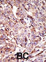 Formalin-fixed and paraffin-embedded human cancer tissue reacted with the primary antibody, which was peroxidase-conjugated to the secondary antibody, followed by AEC staining. This data demonstrates the use of this antibody for immunohistochemistry; clinical relevance has not been evaluated. BC = breast carcinoma; HC = hepatocarcinoma. |