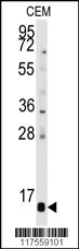 Western blot analysis of anti-PFDN6 Antibody (N-term) (Cat. AMM08569G) in CEM cell line lysates (35ug/lane). PFDN6 (arrow) was detected using the purified Pab. |