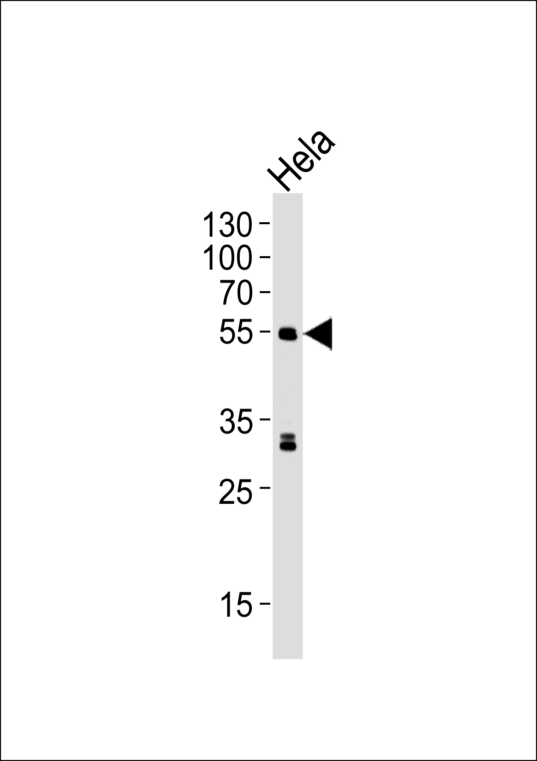 Western blot analysis of lysate from Hela cell line, using Tubulin-alpha 1 antibody(APR13884G). APR13884G was diluted at 1:1000. A goat anti-rabbit IgG H&L(HRP) at 1:10000 dilution was used as the secondary antibody.Lysate at 20ug. |