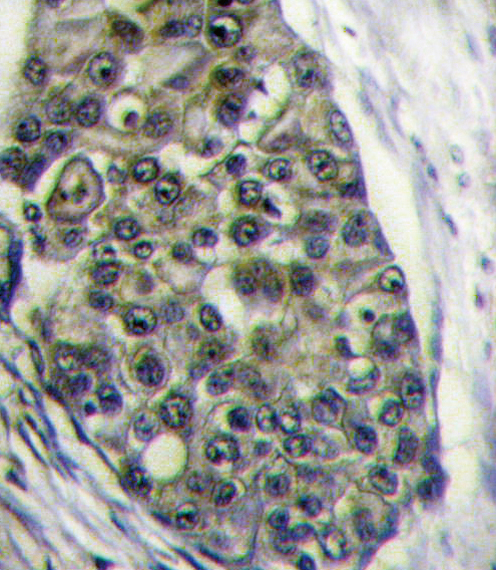Formalin-fixed and paraffin-embedded human breast carcinoma tissue reacted with LRP6 Antibody (C-term T1546)(Cat. APR14063G), which was peroxidase-conjugated to the secondary antibody, followed by DAB staining. This data demonstrates the use of this antibody for immunohistochemistry; clinical relevance has not been evaluated. |