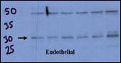 Endothelial cell lysate transferred to membrane was incubated with primary antibody at a 1:500 dilution in 2% BSA in TBST at 4deg C overnight. Data courtesy of Dr. Katherine Healey, NWCRF Institute, School of Biological Sciences, University of Wales Bangor.