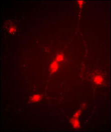Immunofluorescence image of cultured chick retinal amacrine (neuronal) cells labeled with CLC4 Antibody (C-term) (Cat APR10865G). Data courtesy of Emily McMains, Louisiana State University.