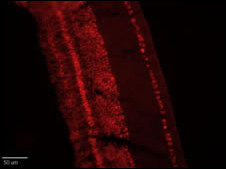 Retinae were collected from adult White Leghorn chicken and fixed in the eyecup for two hours in 4% Paraformaldehyde (in PBS). Retinae were then removed from the eyecups and incubated in 30% sucrose (in PBS) overnight. Retinal tissue was embedded and frozen in OCT compound and cut into ~15um sections on a cryotome. Sections were blocked in 5% normal goat serum (in 1%BSA/.1%saponin PBS) for one hour and then incubated at RT with 1:250 (1%BSA/.1% saponin PBS) ClC4 antibody (Cat. APR10865G) for 1 hour. Sections were then washed in PBS (3X10minutes) and then treated with secondary antibody (1:500 Cy3) for one hour. After another PBS wash series, sections were coverslipped and antibody labeling was visualized at 20X with a Leica upright microscope using a TRITC filter set and Xenon lamp illumination. (Crousillac et al, 2003) |