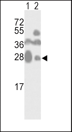 Western blot analysis of CD81 Antibody (C-term) (Cat. APR10941G) in mouse kidney(lane 1) and cerebellum(lane 2) tissue lysates (35ug/lane). CD81 (arrow) was detected using the purified Pab.