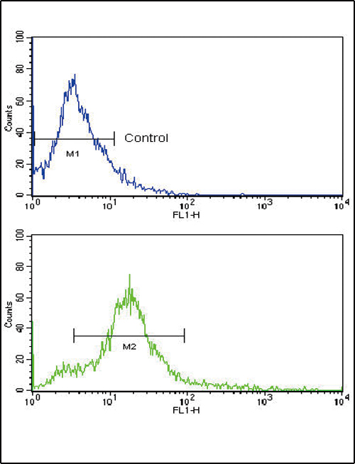 Flow cytometric analysis of 293 cells using CD81 Antibody (C-term) (bottom histogram) compared to a negative control cell (top histogram). FITC-conjugated goat-anti-rabbit secondary antibodies were used for the analysis. |