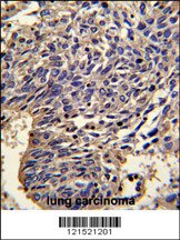 Formalin-fixed and paraffin-embedded human lung carcinoma reacted with IL1A Antibody (Center), which was peroxidase-conjugated to the secondary antibody, followed by DAB staining. This data demonstrates the use of this antibody for immunohistochemistry; clinical relevance has not been evaluated.