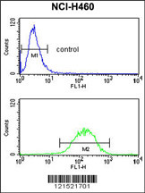 IL1A Antibody (Center) (Cat. APR10887G) flow cytometry analysis of NCI-H460 cells (bottom histogram) compared to a negative control cell (top histogram).FITC-conjugated goat-anti-rabbit secondary antibodies were used for the analysis. |